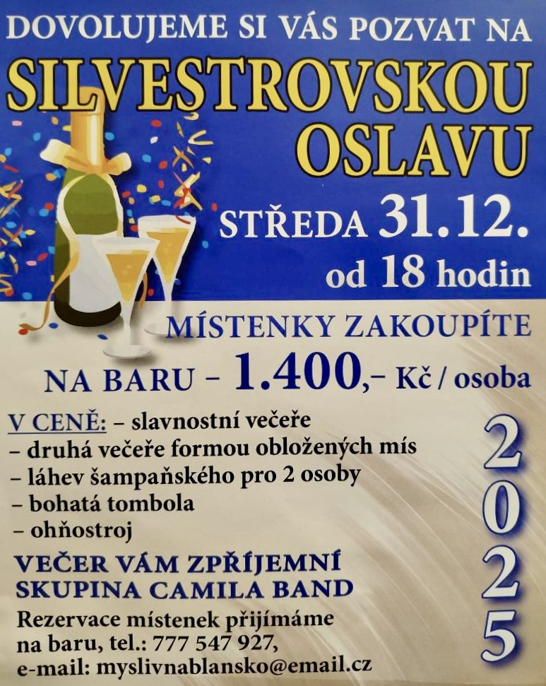 Rezervace míst na baru, telefonu 777 547 927, nebo e-mailu myslivnablansko@email.cz